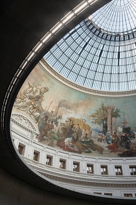 A few minutes from the Louvre, the Bourse de Commerce - Pinault Collection offers one of Paris’s cleverest transformations. Today it is a leading contemporary art museum. For much of its life, it was where the city worried about grain prices, traded commodities and quietly made fortunes. Paris has always known how to dress commerce well. The building began in the 18th century as the Halle au Blé, the grain exchange. At a time when bread shortages could shake governments, this was serious territory. The first dome was considered bold engineering, then burned in 1802. Paris responded by rebuilding it with iron and copper, decades before the Eiffel Tower made metal fashionable. Step inside now and the drama begins instantly. Above you stretches a vast painted cupola from the 19th century, filled with allegories of world trade, ships, distant ports and grand optimism. Then comes the masterstroke: Tadao Ando inserted a monumental concrete cylinder into the center of the historic rotunda. Frescoes above, smooth raw concrete below. It sounds improbable. It looks magnificent. The atmosphere is calm, spacious and quietly confident. Galleries curve around the circular plan, creating shifting views and elegant surprises. One moment you are facing a provocative artwork, the next you are standing in a former exchange hall beneath murals celebrating capitalism. Few museum visits cover so much ground so gracefully. Even lunch keeps the story going. The restaurant, Halle aux Grains, nods to the building’s wheat trading past while serving cuisine under one of the finest domes in Paris.
