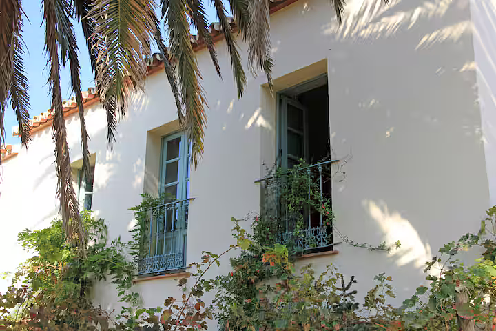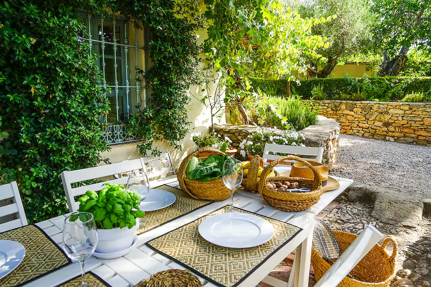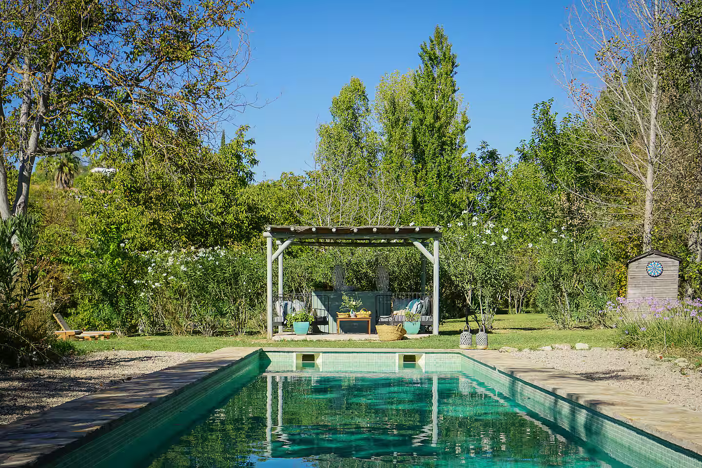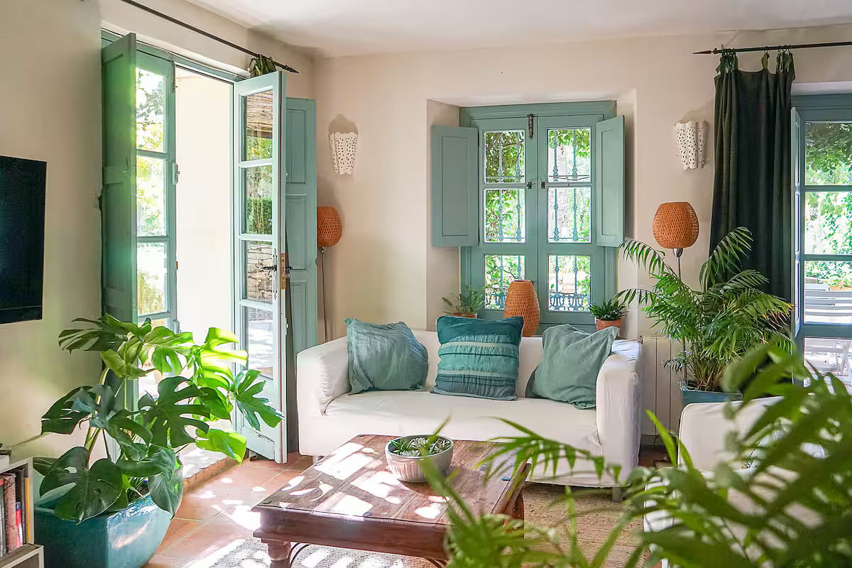 Set within five acres of orchards and gardens, this old farmhouse is divided into two adjoining homes, each with its own private entrance. The owner lives in one of them part of the year. The only shared space is the swimming pool and its surrounding garden, located a short one to two minute walk from the house in the larger grounds. The owners may occasionally use the pool. There are also a few cats on the property. The house has thick stone walls that keep it cool during the summer and warm in winter with central heating and two wood burning stoves. Guests have access to a private garden as well as acres of shared land with fruit and nut trees. Inside, the atmosphere is calm and comfortable, with soft neutral tones and touches of pale grey blue. A pool table, shaded seating areas, and shelves of books on Spain add to the relaxed feel of the house.