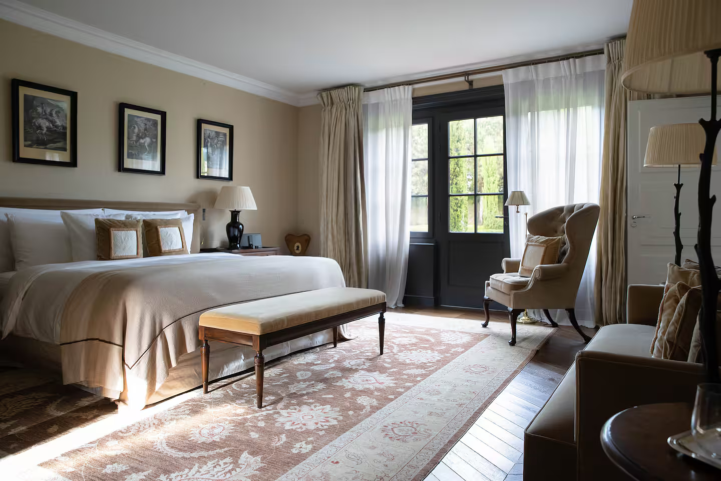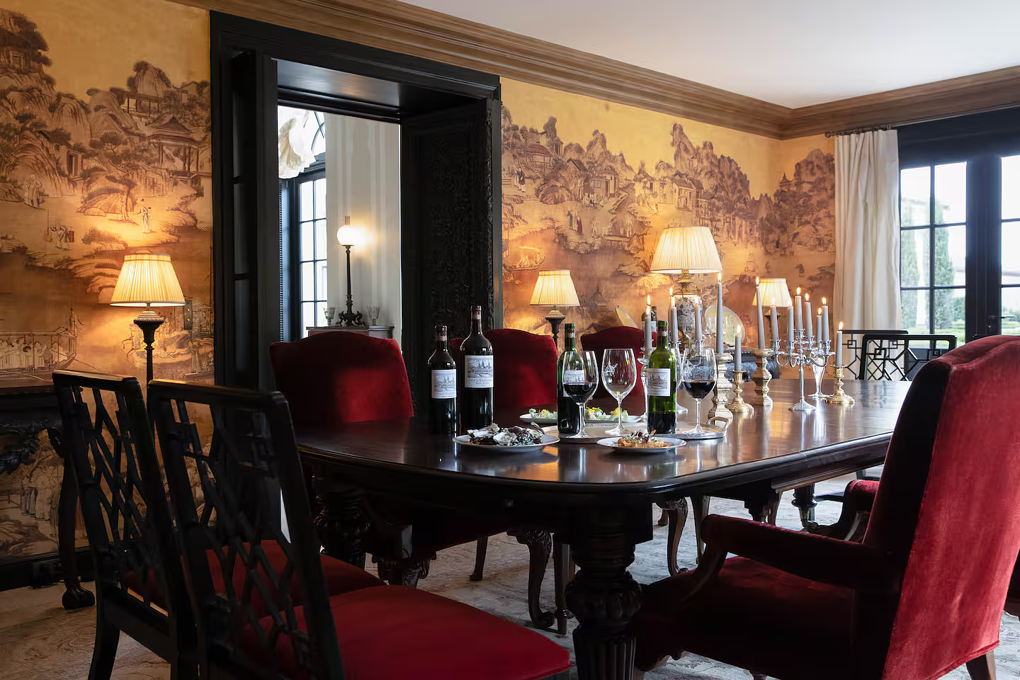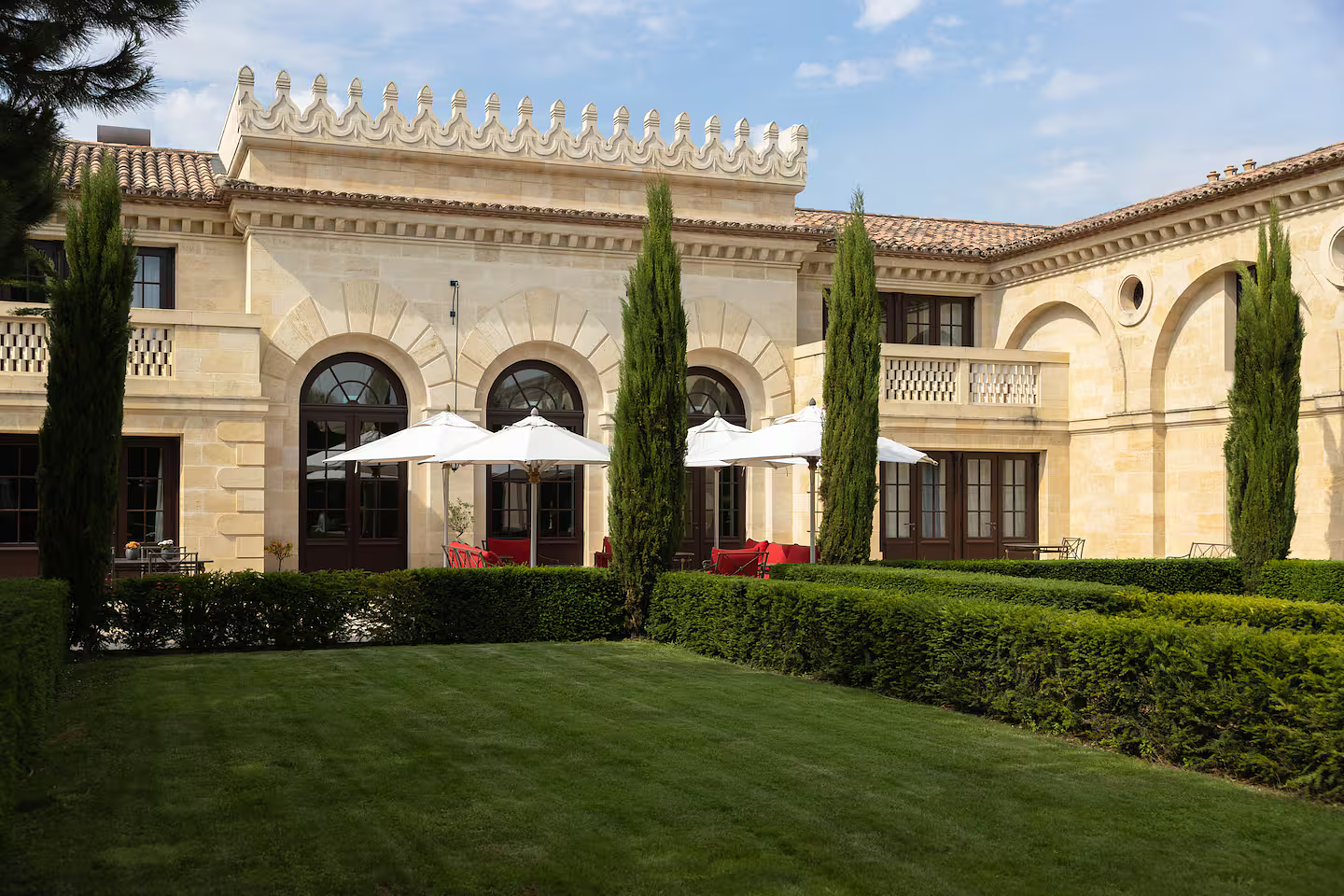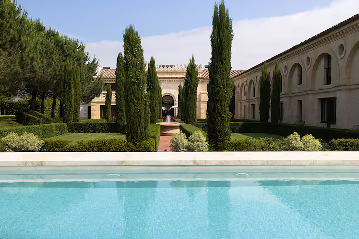 At the heart of the vineyards of Saint Estèphe, just north of Bordeaux, lies Château Cos d’Estournel, one of the most distinctive wine estates of the Médoc. The property owes its singular character to its founder, Louis Gaspard d’Estournel, an eccentric nineteenth century wine merchant whose fascination with Asia left a permanent architectural mark on the estate. The cellars, crowned by exotic pagodas and monumental gates, still stand as one of the most unusual silhouettes in the Bordeaux landscape.  Tucked beside these historic buildings is La Chartreuse, a private residence within the estate that can occasionally be rented in its entirety. The house belongs to the owner of the château, entrepreneur Michel Reybier, who transformed it into a discreet retreat overlooking the surrounding vines. The architecture follows the tradition of Médoc country houses built in pale Gironde stone, while the interiors introduce the same oriental accents that define the estate. Carved Indian doors, silk fabrics and gold leaf chandeliers sit comfortably alongside French fireplaces and quiet libraries.  With eight bedrooms spread across roughly 1500 square meters, the residence functions as a private home rather than a hotel. Guests stay within the working rhythm of a historic grand cru classé estate founded in 1811, with access to the cellars, tastings of the château’s celebrated wines and long views across vineyards that have shaped the reputation of Bordeaux for more than two centuries.  The experience places visitors inside one of the Médoc’s most idiosyncratic estates, where wine, architecture and a curious nineteenth century fascination with the East still define the atmosphere of the property.