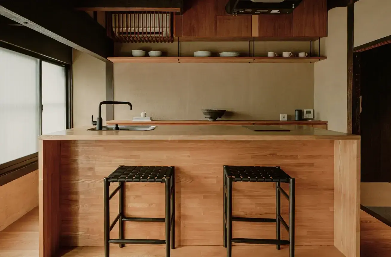 Set along a quiet stretch near the Kamo River, Maana Kamo occupies a restored machiya townhouse that treats space with almost obsessive restraint. The architecture keeps its original timber skeleton intact, yet strips away ornament to reveal clean volumes, pale plaster walls and carefully framed light. Sliding doors open onto a small inner garden where stone and moss soften the geometry, a reminder that Kyoto never abandons nature, even indoors. There is no restaurant, no lobby, no visible staff presence. Instead, a discreet kitchen invites you to engage with the city’s food culture yourself, often supported by curated local suppliers or private dining experiences. The absence of service becomes part of the experience. You are left alone with the proportions of the house, the creak of wood, the rhythm of the neighborhood. Expect calm, precision and a certain discipline. Those looking for indulgent hotel comforts will find little to hold on to. Those who appreciate architecture as a lived experience will find something rare.