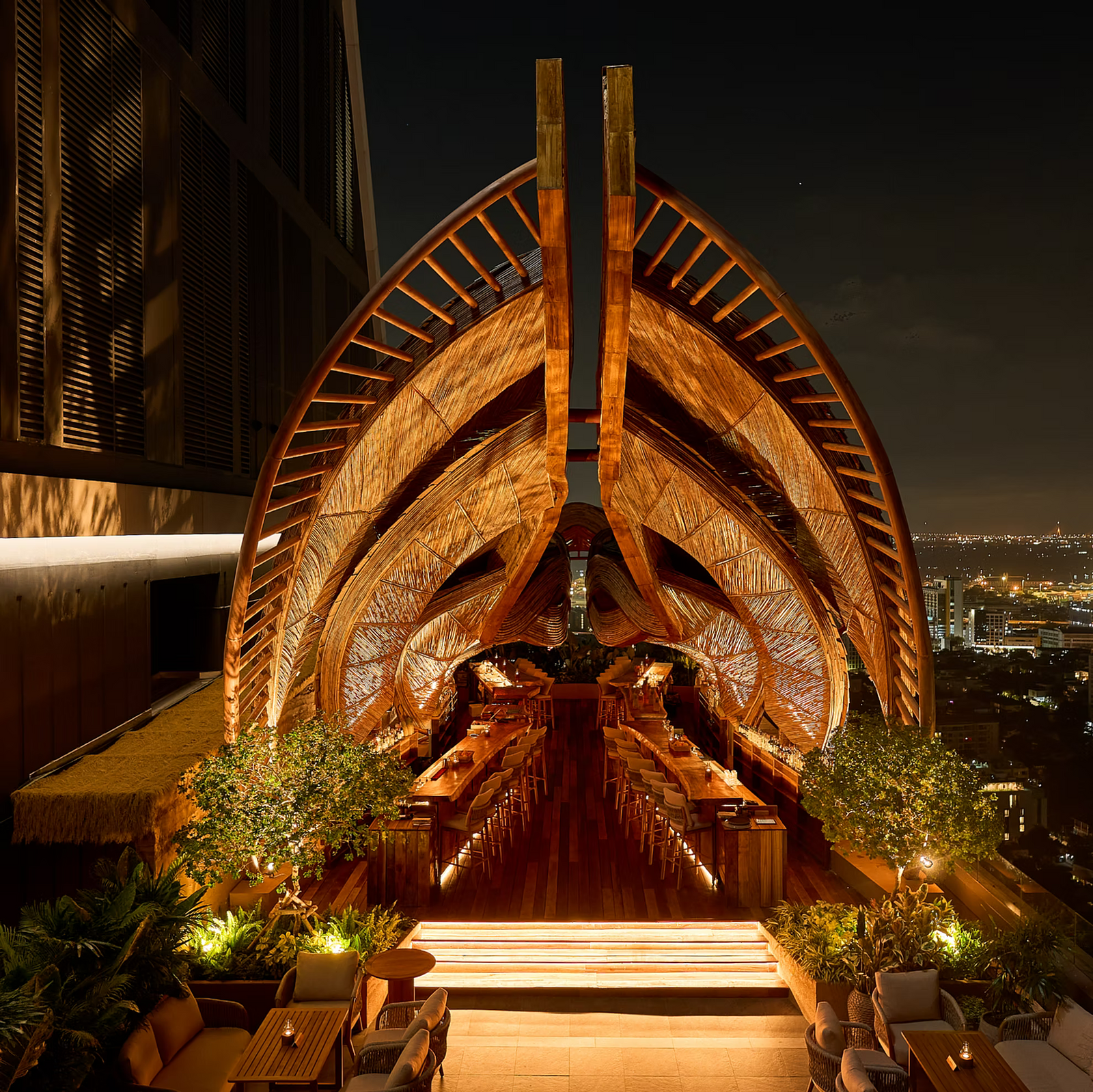 On the 34th floor of InterContinental Sukhumvit, Sanctuary plays a clever Bangkok trick: it makes the city feel quieter without pretending the traffic stopped. The setting is the headline. A biophilic rooftop built from warm timber, bamboo, rattan and dense greenery, shaped to read like a floating boat among trees. Time Out had the same impression.  Drinks are where the place shows its personality. The menu splits into four lanes, from Thai botanical “familiar flavourtails” to dessert driven “comfortails” and a daredevil “wildtails” section that toys with ingredients like red ant eggs, giant water bugs and fermented fish.  If you prefer your bravery in liquid form, the house signatures turn Thai classics into cocktails, like Mango Sticky Rice or Banana Roti, while food leans into playful, high impact plates: tuna miang kham, beef tongue with phat kaphrao sauce, a Thai wagyu katsu sando, even caviar with white chocolate ice cream.  The concept comes from Paper Plane Project Group in collaboration with Taiwan based O’bond, which explains the design obsession and the restless cocktail brain.  Sanctuary also picked up a 2025 Restaurants and Bars Design Awards title for Global No.1 Alfresco and Biophilic Design, which feels entirely on brand once you see the space.