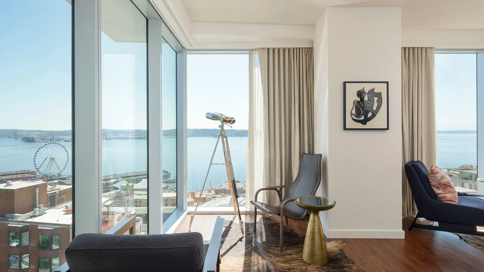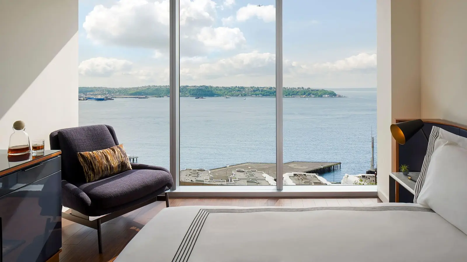 Across from the constant theatre of Pike Place Market, Thompson Seattle rises in glass and dark metal, a sharp, confident line against the shifting skies of Elliott Bay. The building, designed by Olson Kundig, treats the view as its central material. Floor to ceiling windows frame ferries, gulls and the slow choreography of the waterfront. Inside, the mood leans urban and composed. Stone, leather and deep tones echo the grit and polish of modern Seattle. The rooftop bar draws a well dressed crowd at dusk, when the bay turns silver and the market lights flicker on below. It feels contemporary yet rooted in place, a hotel that understands its city and lets the scenery carry the conversation.