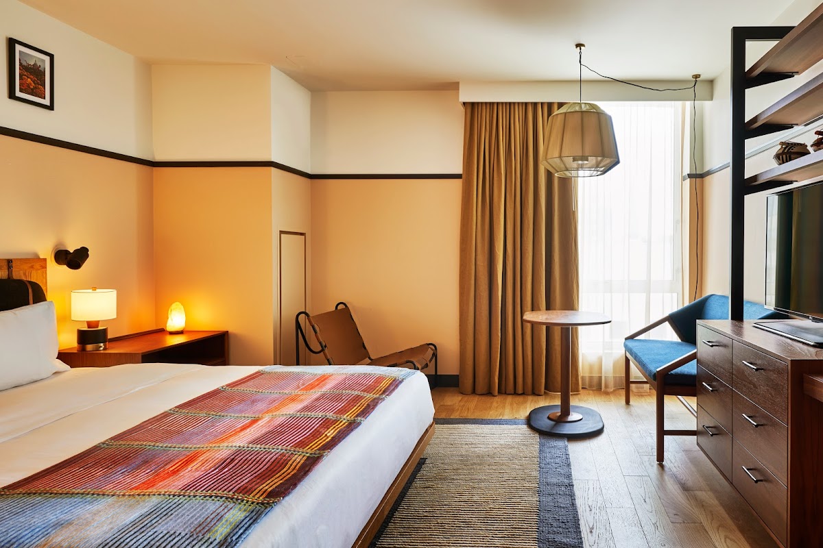 A few blocks from McPherson Square, the Eaton hotel occupies a 1963 modernist office building on Washington’s business minded K Street. The concrete frame and gridded facade remain largely intact, a reminder of the capital’s era of sober postwar expansion. Inside, the mood shifts. Katherine Lo’s 2018 transformation introduced warm wood, vinyl lined libraries, and a working radio station that broadcasts from the lobby. The result feels part salon, part hotel, with journalists, musicians, and policy thinkers drifting between the cafe and rooftop bar. In a city known for polished formality, Eaton favors conversation, curiosity, and the gentle friction of ideas.